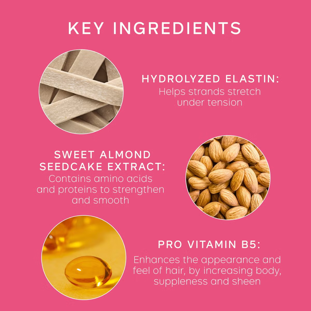- Sweet Almond Seedcake Extract – rich in amino acids and proteins to reinforce and smooth each strand