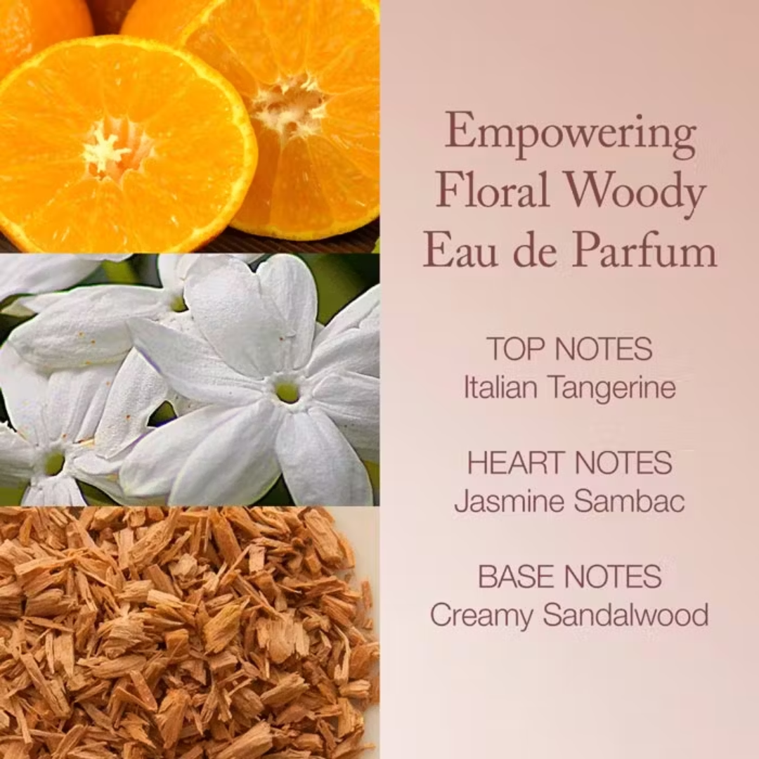 The scent opens with an inviting burst of Italian tangerine, juicy pink berries, and crisp Nashi pear, offering a fresh and captivating first impression. At its heart lies a delicate floral bouquet of orris, jasmine sambac, and dewy honeysuckle—graceful and luminous. As it settles, the fragrance reveals a warm and sensual base of cashmere woods, sandalwood, and crystallised amber, leaving a lingering trail of elegance and confidence.