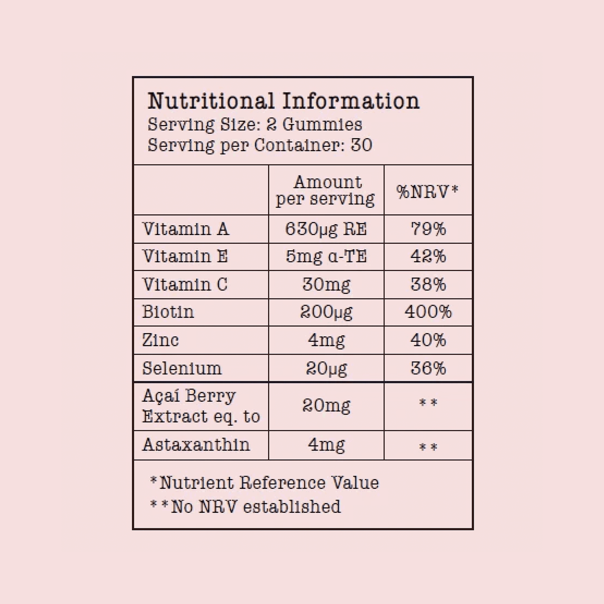 Astaxanthin: clinically proven to improve skin texture, elasticity and the appearance of fine lines. Açai Berry extract: packed with antioxidants that help to minimise cell damage. Biotin: Biotin supports healthier, stronger hair, skin and nails. Inulin: a prebiotic fibre for a healthier gut and glowing skin. Vitamins A,C,E: a cocktail of antioxidants for that ultimate luminous skin. Zinc + Selenium: essential minerals that nourish cells and support the immune system.