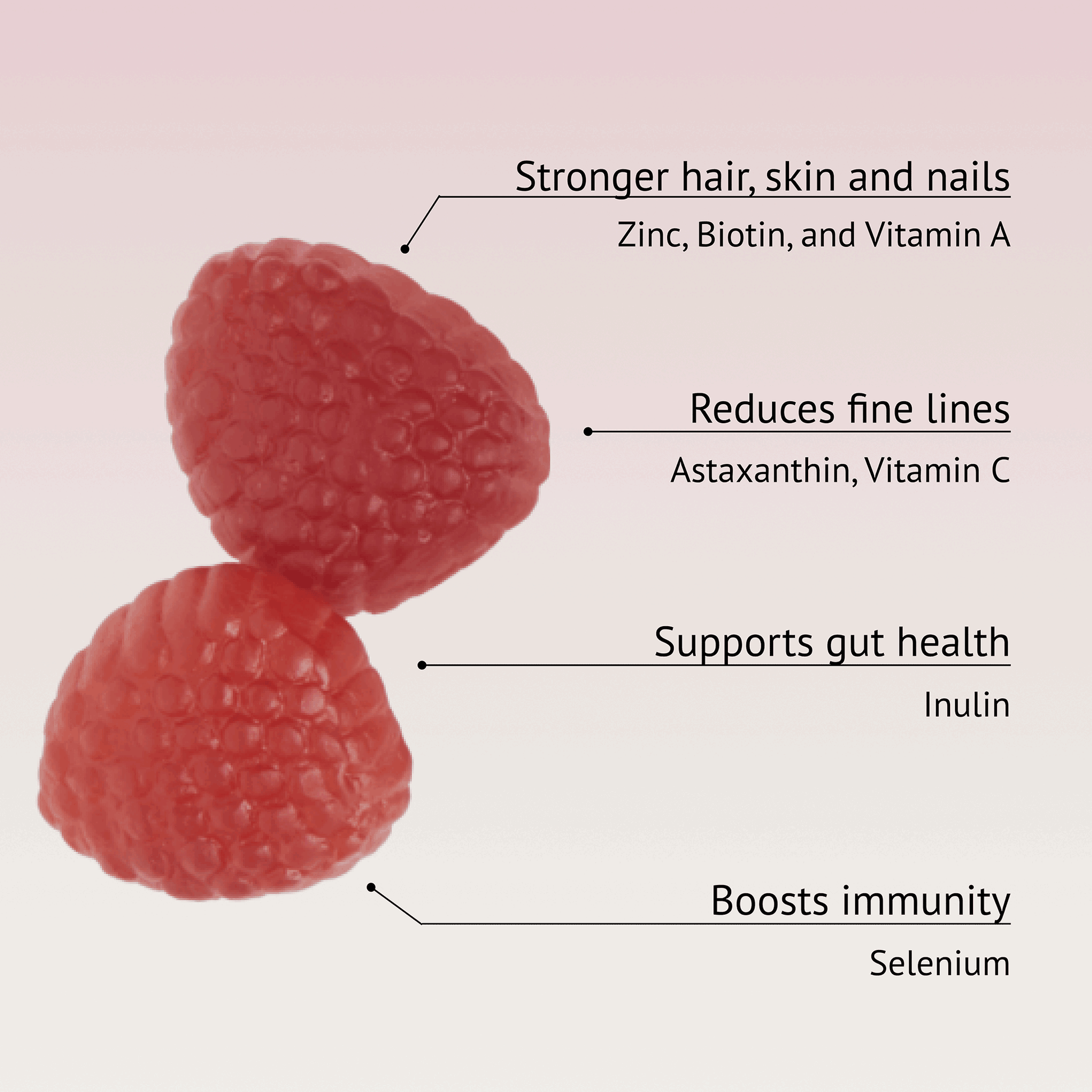 Powered by a carefully selected blend of Astaxanthin, Biotin, Inulin and Açaí Berry, these daily gummies support healthy hair, skin and nails from within, helping you look and feel your best every day.